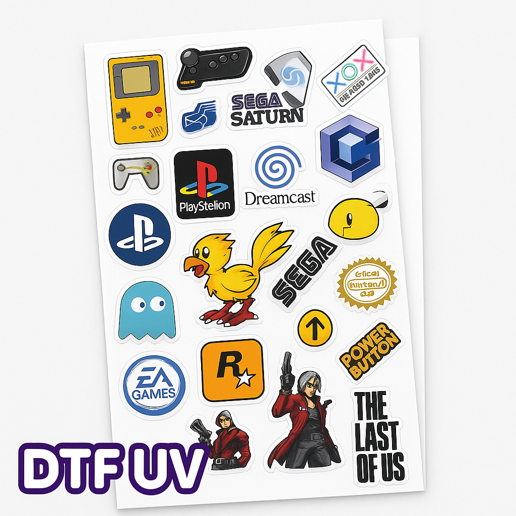 Adesivo DTF UV com brilho e relevo. Aplicável em superfícies rígidas como vidro, plástico, MDF e metal. Personalize com qualidade!