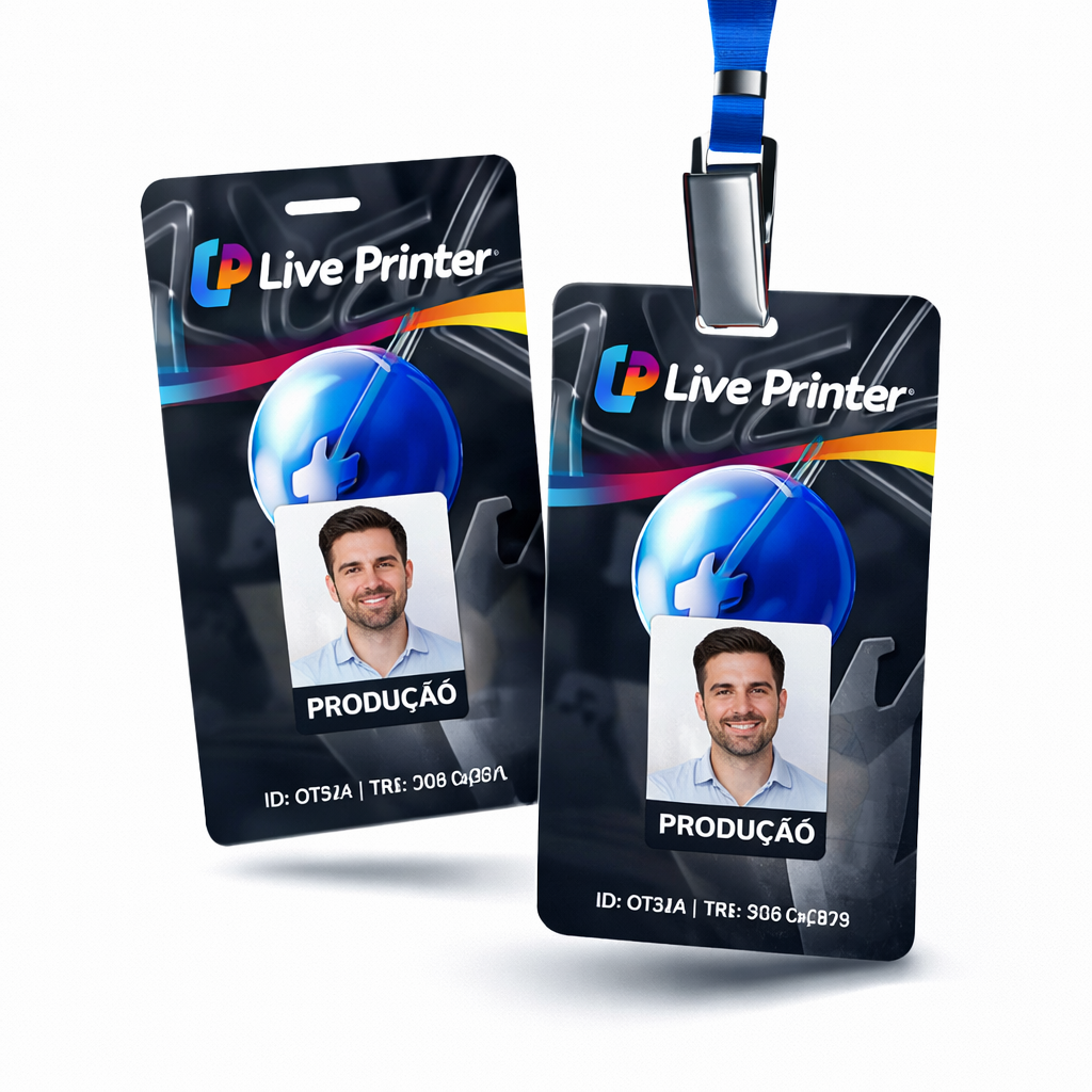 - Opções de personalização: inclusão de foto, nome, cargo, logo da empresa, código de barras, QR Code ou tarja magnética.