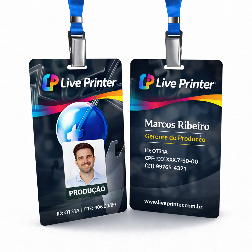 - Opções de personalização: inclusão de foto, nome, cargo, logo da empresa, código de barras, QR Code ou tarja magnética.