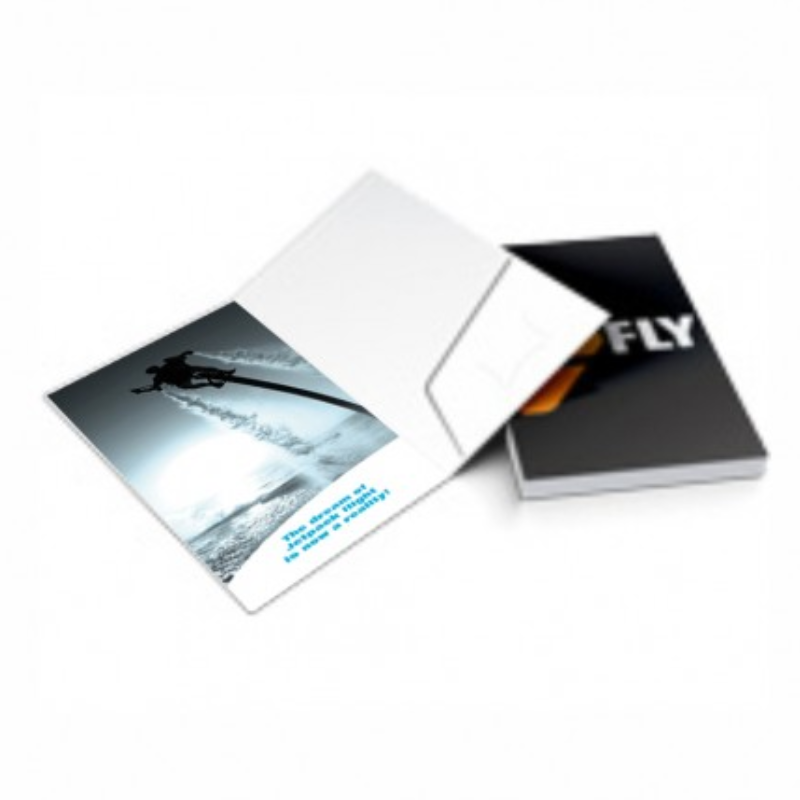 A bolsa interna permite acomodar papéis soltos com praticidade, evitando dobras ou extravios. O papel 250g garante boa resistência e estrutura, enquanto o acabamento em verniz UV na frente valoriza a arte gráfica, proporcionando destaque visual, brilho e maior percepção de qualidade.