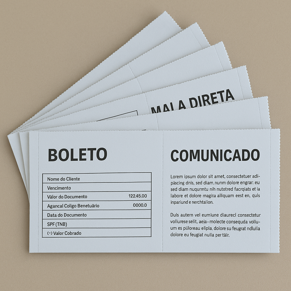 Oferecemos impressão de alta qualidade para boletos de cobrança, garantindo clareza e profissionalismo em cada detalhe. Agilize seus recebimentos e proporcione comodidade aos seus clientes.